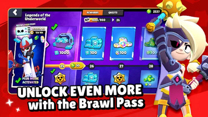 Arenda oma kaklejaid üha võimsamaks, avades uusi oskusi ja kogudes trofeesid. Brawl Pass pakub rikkalikke auhindu, sealhulgas kalliskive, võimsuspunkte, pinsse ja Starr Drops'e, igal hooajal uue ja värske sisuga. Tõuse edetabelite tippu, et tõestada oma osavust globaalses ja kohalikus konkurentsis. Loo või liitu klubiga koos teiste Brawl Starsi mängijatega, jagage näpunäiteid ja astuge koos lahingusse. Maailm areneb pidevalt, tuues sisse uusi kaklejaid, kaarte, nahku ja mängurežiime, tagades, et iga päev on täis uusi seiklusi. Avasta kogukonna loodud kaarte ja naudi dünaamilisi PvP sündmusi, mis pakuvad pidevalt uusi väljakutseid ja meelelahutust.