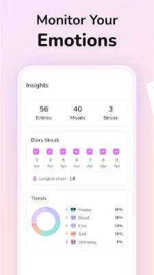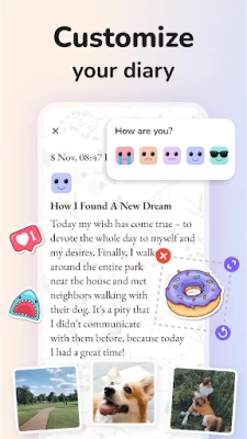 Muutke oma päevik pelgalt tekstikogumist millekski enamaks, lisades iga sissekande juurde fotosid. Nii saab iga lehekülg elavaks mälestuseks, mis jutustab lugu nii piltides kui ka sõnades. Lisaks pakub **Daily Diary: Journal with Lock** nutikat meeleolujälgijat, mis kutsub teid iga päev oma emotsioone märkima. See süsteem aitab aja jooksul märgata mustreid, mõista, mis teid rõõmustab või kurvastab, ja seeläbi edendada sügavamat enesetundmist ning emotsionaalset heaolu.